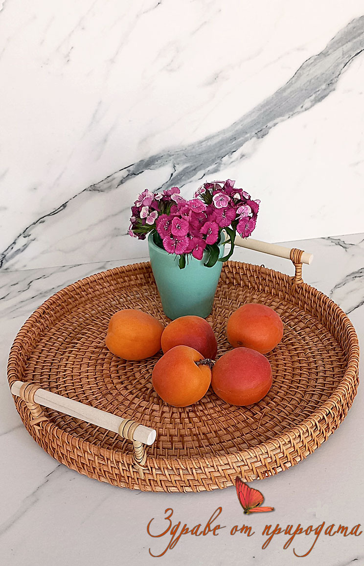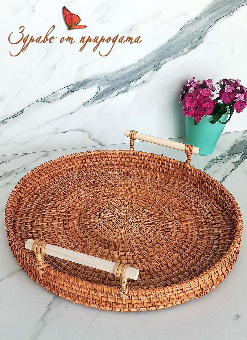 Подносът е изработен от 100% ратан, ръчно плетен, с удобни дръжки за лесно транспортиране и сервиране.