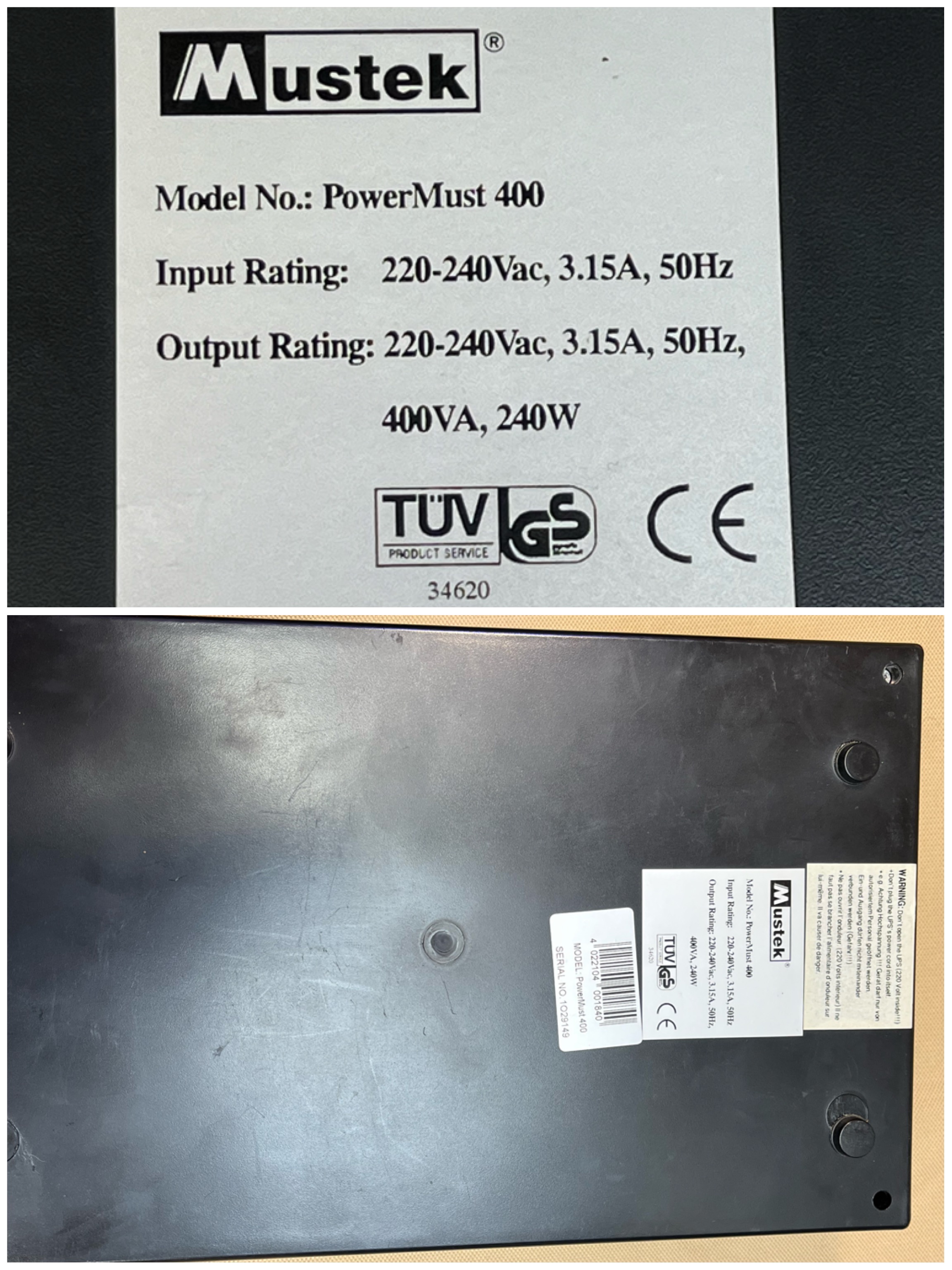 Input Rating: 220-240Vac, 3.15A, 50Hz Output Rating: 220-240 Vac, 3.15A, 50Hz, 400VA, 240W